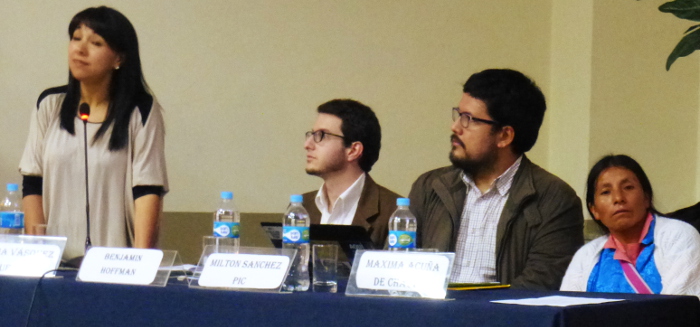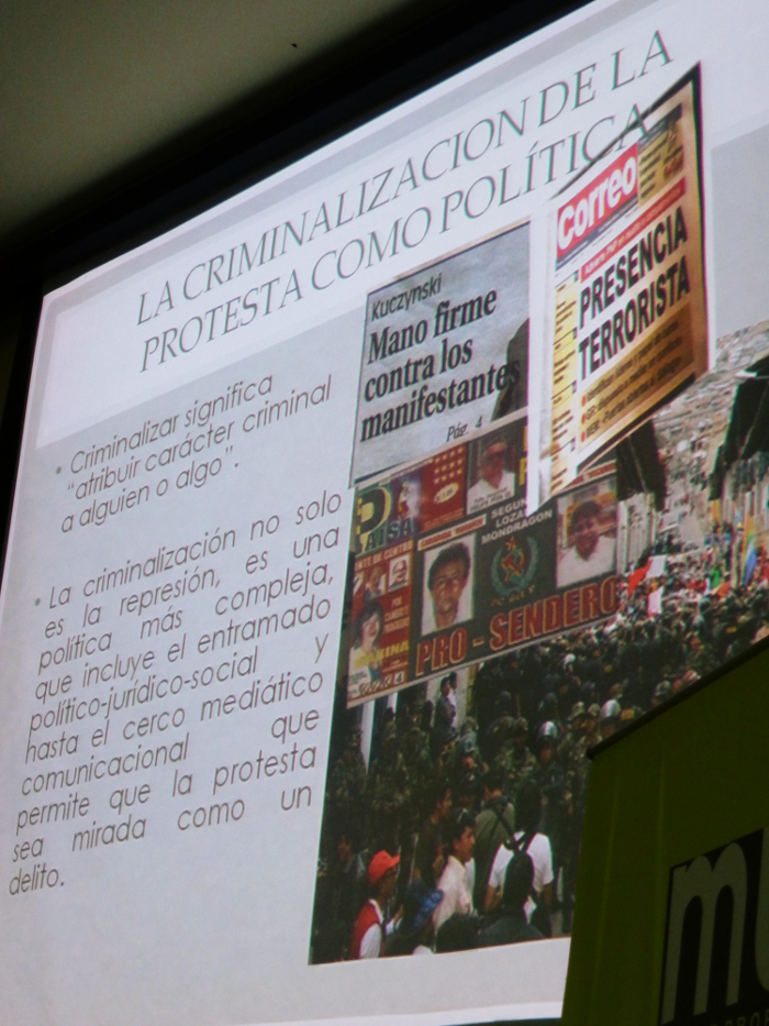s Humanos, CARE, IBC (Instituto del Bien Común / Institut für das Gemeinwohl) und AIDESEP (Interethnischer Verband für die Entwicklung des Peruanischen Regenwaldes). Am zweiten Konferenztag stellte das Red Muqui den Fall Yanacocha vor, der größten Goldmine Lateinamerikas in Cajamarca im Norden Perus. In Kooperation mit Grufides und der Plataforma Interinstitucional de Celendín (PIC) zeigten sie den Dokumentarfilm “La hija de la Laguna“ (vom Film-Kollektiv Guarango), über den ich hier schon einmal geschrieben hatte. Máxima Acuña Chaupe und Elmer Campos erzählten, welche Auswirkungen die Macht der Mega-Unternehmen auf ihr Leben hat: Elmer wurde bei einer Demonstration gegen die Erweiterung der Goldmine (Conga-Projekt) in Cajamarca 2012 von einem Polizisten angeschossen und sitzt seitdem im Rollstohl, Máxima kämpft seit Jahren gegen Yanacocha um ihr Land, das sie nicht aufgeben will (siehe Blog-Eintrag David gegen Goliath, April 2015).