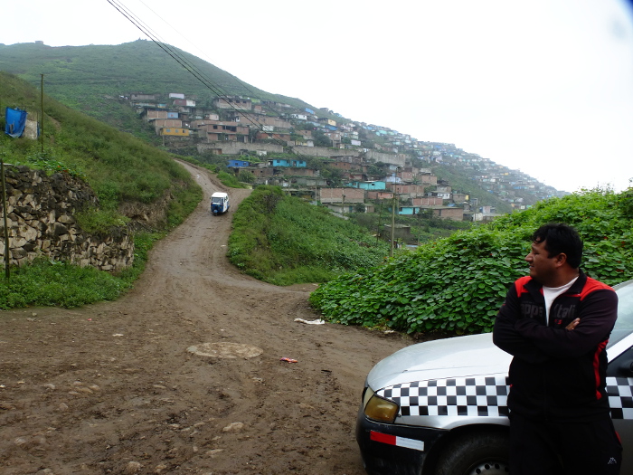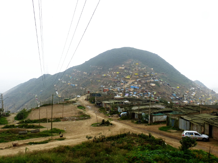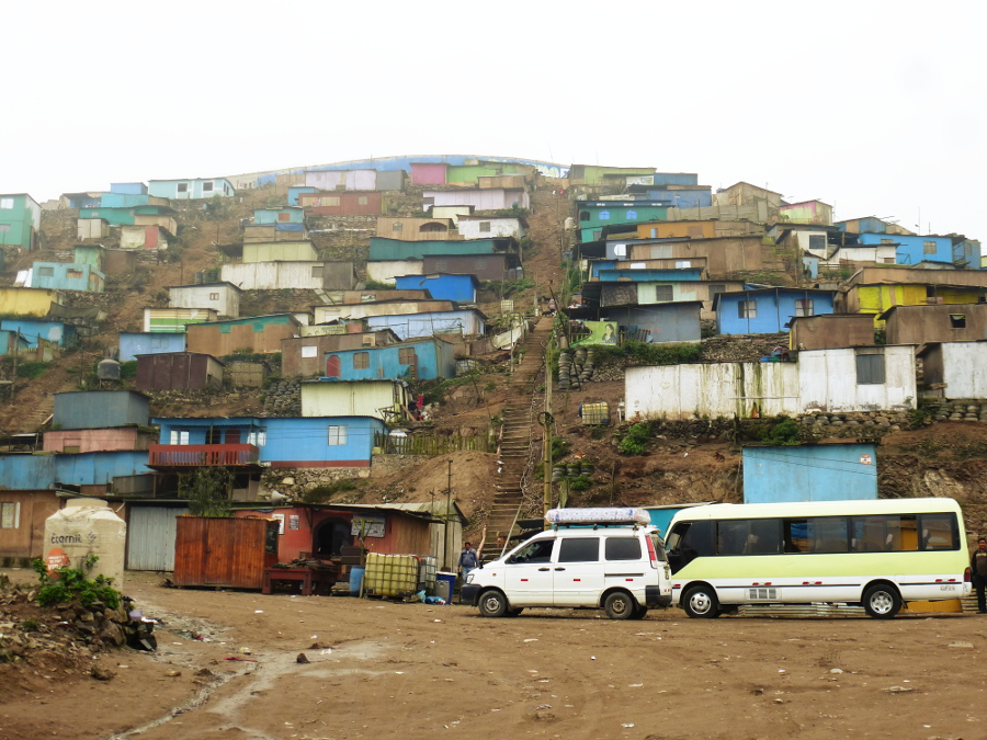 Blick ins Tal. Bis zum Horizont haben sich die illegalen Siedlungen von Hügel zu Hügel gefressen. Richard Aguilar deutet nach rechts: „Diese Häuser waren bei unserem letzten Besuch noch nicht da.“ Er erklärt, wie die Landnahme vor sich geht: Menschen besetzen ein Stück Land und bauen provisorische Holzhütten – die Bausätze dafür werden an der Straße verkauft. Wenn die Polizei die Invasion nicht sofort beendet, werden die Besetzer zu Besitzern mit Anspruch auf das Land. Nach fünf Jahren haben sie ein Recht auf Wasser- und Stromleitungen. Alles ist perfekt legal, deshalb hat der Wasserversorger Sedapal drei riesige Wassertanks in das Tal von Bellavista gebaut.
